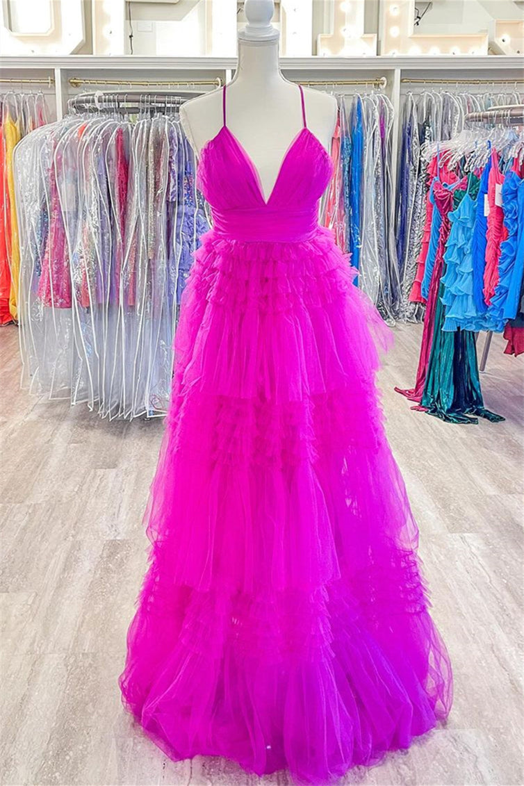 V Neck Fuchsia Tulle A-line Party HZ0307